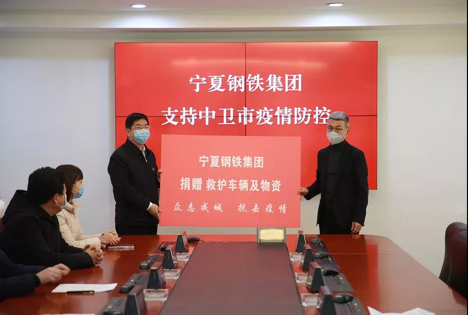 1月28日,寧夏鋼鐵集團(tuán)向中衛(wèi)市捐贈了價(jià)值200萬元的4輛救護(hù)車及600套鋪蓋、55臺電暖氣、55個(gè)電熱水壺、6萬元的方便面和礦泉水等物資,第一時(shí)間支援中衛(wèi)市新型冠狀病毒肺炎防控抗擊工作。